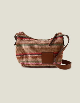 This cross-body bag from Accessorize will become your favourite warm weather accessory. The textured raffia design has a scoop shape that sits comfortably against the body. An adjustable faux leather buckle strap and gold metallic hardware add a premium touch.