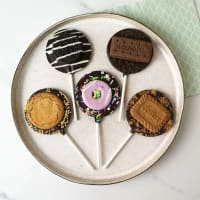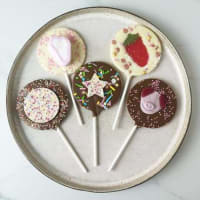 The set includes 5 individually wrapped lollipops made with thick Belgian chocolate., which fit through a standard letterbox.