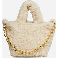 Ella Chain Detail Top Handle Tote Bag In Brown Faux Shearling,, Brown