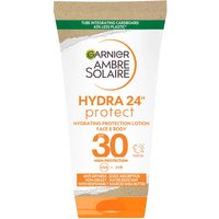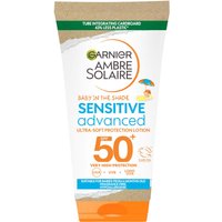 Garnier Ambre Solaire Kids Sensitive Sun Cream SPF 50+ Travel Size provides 50 times your child's skin's natural protection, preventing burning and protecting your little ones whilst they enjoy the sun. Enriched with a hydrating complex and vitamin E, it also maintains your skin's moisture levels during sun exposure, reducing dryness. Non-greasy, the lightweight lotion quickly sinks into their skin, so you can enjoy the sun safely. Directions of Use: Apply a generous amount approximately half an hour before sun exposure. Re-apply frequently, especially after swimming, towelling and perspiring.