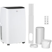 A multifunctional air conditioning unit, from HOMCOM: it cools, dehumidifies and ventilates. It also has a sleep mode (quiet) too, with a 24-hour timer, making it suitable for night-time use. Controlled by both an App and remote, it's very easy to use, even if you're far away. Set the temperature between 16-30℃ - easy to pick a temperature most comfortable for you. Complete with the self-evaporating system, which helps reduce the amount of times you need to empty the tank.Features:Four modes: cools, dehumidifies, ventilates and sleeps. Two speeds and adjustable 16-30℃ temperatureThree ways to control: smart WiFi App(TUYA, smart life), remote and with LED control panelRemovable and washable filter, with self-evaporating systemFour wheels on the base to move the unit around easilyVertical direction of air flow can be adjusted up and down automatically24-hour timer allows you to set it to a specific timeLED display to show the settings, indicator light to show the working modeIncluded pipe to drain the water, warning when water fullSliding window kit included
