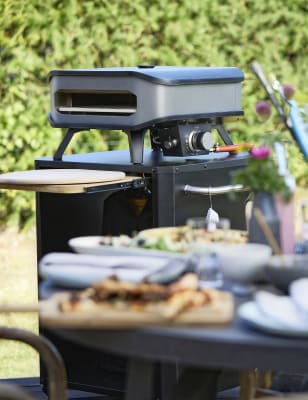 Bring a taste of Italy to your garden with the Kettler gas pizza oven. Measuring 17", it has a large front opening to make cooking easier. A ceramic pizza stone helps create a tasty crust by evenly distributing heat. It comes with a thermometer and an easy-to-control temperature dial on the side for a perfectly cooked pizza every time.