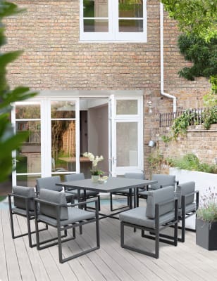 Host al fresco meals with friends at the stylish Surf Active dining set from Kettler. This weatherproof and rust-proof set is made from powder-coated aluminium so it can be stored outdoors without deteriorating. It includes a modern teak-effect glass-top table and six reclining dining chairs so everybody can find a comfortable position.