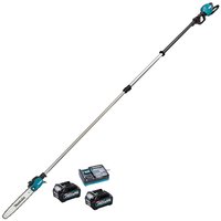 The Makita UA004G is a 300mm (12”) cordless brushless telescopic pole saw powered by 40v Max XGT Lithium-Ion batteries. The overall length without guide bar of the tool is adjustable from approximately 2.6m to 3.8m. The retractable oil tank cap decreases the chance that the saw head will be snagged in branches. Thanks to the high transparency on the chain oil tank, you can easily check the amount of remaining oil. The UA004G also features active feedback sensing technology which will shut down the tool if the rotation speed suddenly slows down. Features & Benefits • Electric brake • Variable speed control • Active Feedback Sensing Technology • Soft start • Slim saw head • High operating efficiency • Lock-off function • Wet guard / IPX4 compatible • Anti-fall captive nut • Integrated branch hook Specifications • Battery Type: Makita XGT 40v Max Lithium-Ion • Voltage: 40v • Chain Oil Capacity: 160ml • Chain Gauge: 0.050” • Chain Pitch: 3/8” • Chain Speed: 0 - 20m/sec • Bar Size: 30cm • Noise Sound Pressure: 90dB(A) • Noise Sound Power: 105dB(A) • Noise K Factor: 3dB(A) • Maximum Output: 1500w • Vibration K Factor: 1.5m/sec² • Vibration (Cutting Wood): 2.5/ 3.1m/sec² Contents • Makita UA004G 40v Max XGT Cordless Brushless Telescopic Pole Saw • No Batteries • No Charger • Saw Chain • Wrench x 2 • Hex Wrench • Band Assembly • Guide Bar • Chain Cover • Round File • Oil Supply • Cap 28 • Cap 24