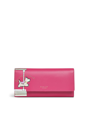 This leather purse from Radley London celebrates the brand's heritage with a metallic Scottie dog design on the front. Inside this sleek foldover style, there are card and note holders, plus a zipped section for coins and receipts. An extra zipped pocket at the back is the perfect place to keep your most-used items close to hand. This piece fastens with a secure press stud closure and is lined with polka dot fabric for a premium touch.