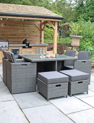 This eight-seater lounge set from Royalcraft is perfect for enjoying your garden or patio. It's made in a contemporary modular style, from woven synthetic rattan on durable aluminium frames. Loose cushions provide extra comfort. This set comes complete with a height-adjustable rectangular table that's ideal for your drinks, books and gadgets.